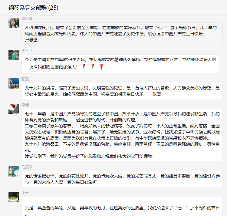 在全球抗疫的特殊背景下,钢琴系党总支全体党员以这种特殊的活动方式庆祝党的生日,强化了党员意识,坚定了理想信念。全体党员明确表示,要在教学与管理教育工作中,全面贯彻落实新时代党的建设总要求,强化政治引领,突出问题导向,为学校办学事业的进一步发展继续努力奋斗。