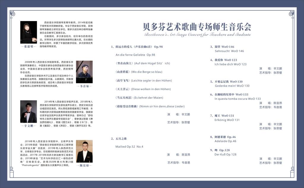 “贝多芬艺术歌曲专场师生音乐会”于2020年12月2日(星期三)晚19:30在西安音乐学院艺术中心室内乐A厅重现经典,激情演绎,本场音乐会受到高度关注,同时间在央视频等网站进行在线直播。本次音乐会是由钢琴系主办,以纪念贝多芬诞辰250周年为主题的系列活动。