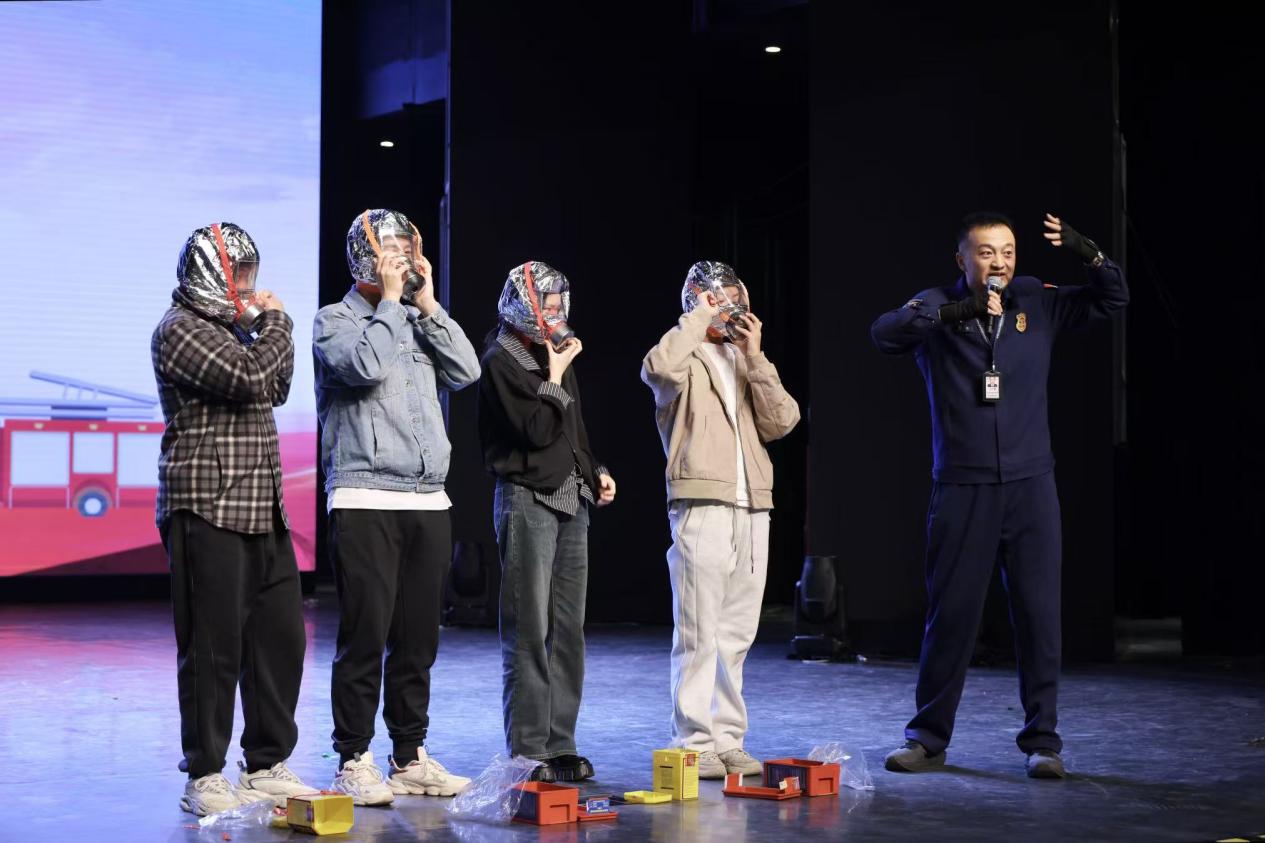 讲座由曲江新区消防救援大队王征担任主讲。王征结合自身丰富的消防救援经历展开讲解,他重点分析了常见火灾情境下的正确应对措施,明确指出许多传统逃生观念已不适用现代火场环境,并就“发生火灾时该如何行动、是否应该立即逃跑”等关键问题提供了科学指导。在灭火器使用教学环节,王征通过两个新颖有趣的短片,现场演示了“提拔握压”四字操作口诀。通过真实案例解析,生动说明了消防设施的正确使用方法,其中特别演示了消防水带“一甩两接拧到底”的连接技巧。同时还设置了实操体验环节,并邀请现场同学上台练习使用防火面具、灭火器及消防栓等消防器材。
